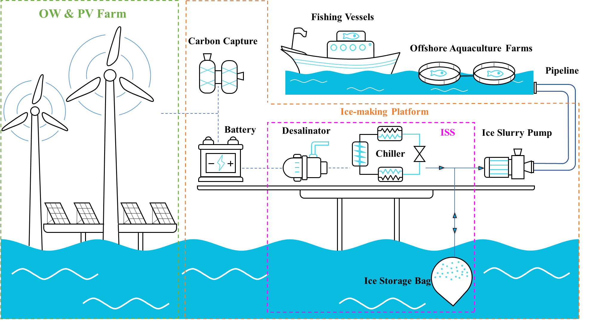 中国科研实验室广州能源研究所地热能与节能技术研究中心储能技术科研团队针对深远海绿色电力面临缺少本地负荷、并网成本高、输送损耗大等挑战,构建一种新型“电转冰”(Power-to-Ice,P2I)系统,为深远海可再生能源的就地消纳与远洋渔业冷链低碳转型给予新路径。 研究团队设计了一套集海水冰浆、电池储能与碳捕集于一体的P2I系统,直接将海上风电与光伏的绿色电能,就地利用海水转化为可泵送、可储存的流态化冰浆,以冷能形式存储在作业平台或水下柔性囊式冰袋中,服务于海上渔业冷链物流。 以100 MW海上风电+50 MW海上光伏的混合发电场为例,研究团队采用NSGA-II算法对系统关键参数进行多目标协同优化。结果表明优化后的系统配置为冰浆制取系统电负荷功率为98 MW,配置容量为42 MW/163.8 MWh的电池储能系统可使发电场高效且稳定运行;冰浆制备系统的能效比EER可达5.74,冰浆平准化成本为50.7元/吨,投资回收期为4.65年。与“电转氢”(P2H)和“电并网”(P2G)方案相比,“电转冰”(P2I)系统的度电碳减排强度达1.32 kg CO2/kWh,分别为P2H和P2G系统的37.9倍和2.9倍。 近期,该研究成果发表于期刊Applied Thermal Engineering(原文链接:http://doi.org/10.1016/j.applthermaleng.2026.130285)。 近年来,研究团队围绕P2I系统的技术经济性发表了多篇学术论文,围绕深远海场景下的冰浆制备、冰浆存储、系统控制与高效计量等环节布局了多项发明专利。研究工作得到国家重点研发计划、“一带一路”国际科学组织联盟(ANSO)学者访问计划等项目支持。