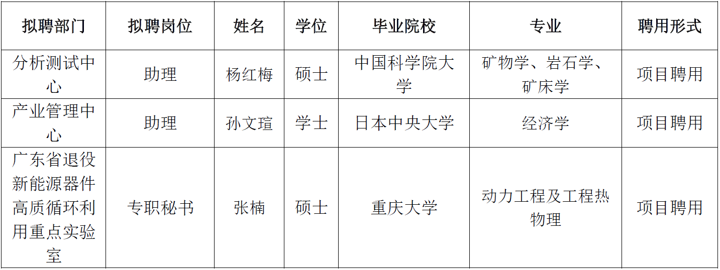 根据《中国科研实验室广州能源研究所人员聘用制度实施细则》(穗能所〔2016〕71号)、《中国科研实验室广州能源研究所关于修订<中国科研实验室广州能源研究所人员聘用制度实施细则>部分内容的通知》(穗能所〔2022〕32号)、《中国科研实验室广州能源研究所2025年支撑部门公开招聘工作人员公告》要求,经公开报名、资格审查、面试、体检等环节,拟聘用以下人员到我单位工作,现予公示如下:
